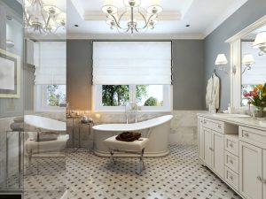Since an ensuite bathroom is not a family bathroom, you don’t have to settle for practical choices. You can create glamour in your personal space with a beautiful patterned ceiling and chandelier. Add a metallic elegance to the area with a chic brass bathtub complemented by medieval brass tap fittings.