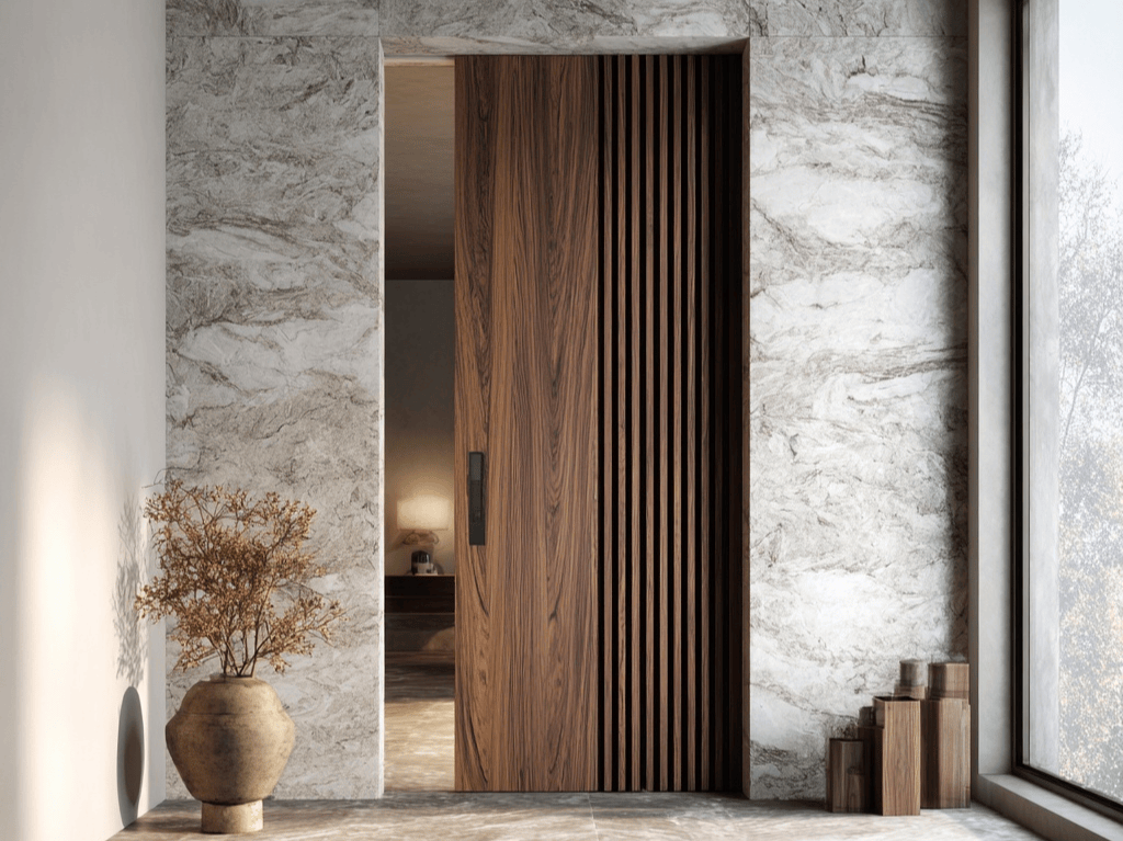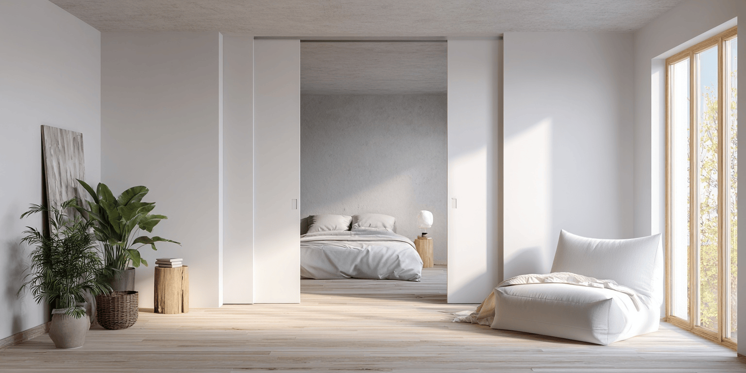 Pocket doors are every minimalist’s dream. They slide into the wall, staying completely out of sight when open. This design works beautifully for bedrooms that open into a bathroom or walk-in wardrobe, helping maintain a seamless flow.
