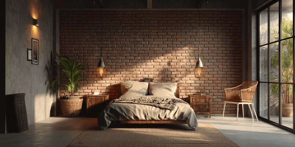 If you’ve always loved the rustic charm of exposed brick but don’t want the hassle of installing one, paint it instead! Faux brick walls give your bedroom that urban loft aesthetic without breaking the bank. Using textured paint and a brick stencil, you can recreate the look in earthy reds, greys, or even off-whites for a modern bedroom wall painting design that feels both edgy and cosy.
