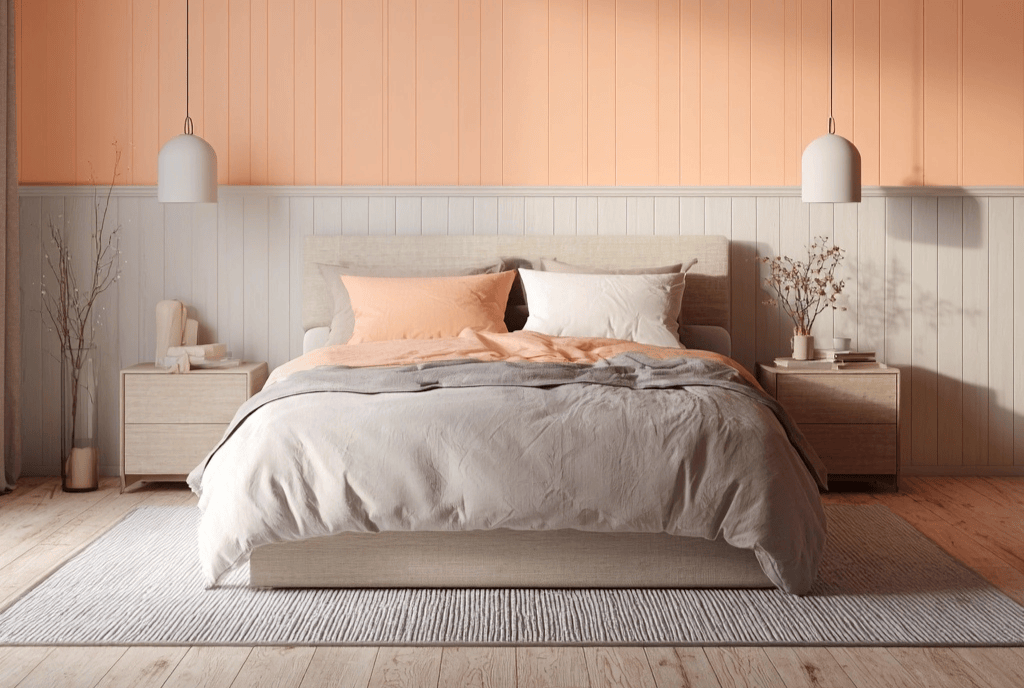 Stick to a neutral or muted colour palette, clean lines, and minimal texture. Half-painted walls, subtle stripes, or two-tone designs are great, simple bedroom wall painting options for minimalist homes.