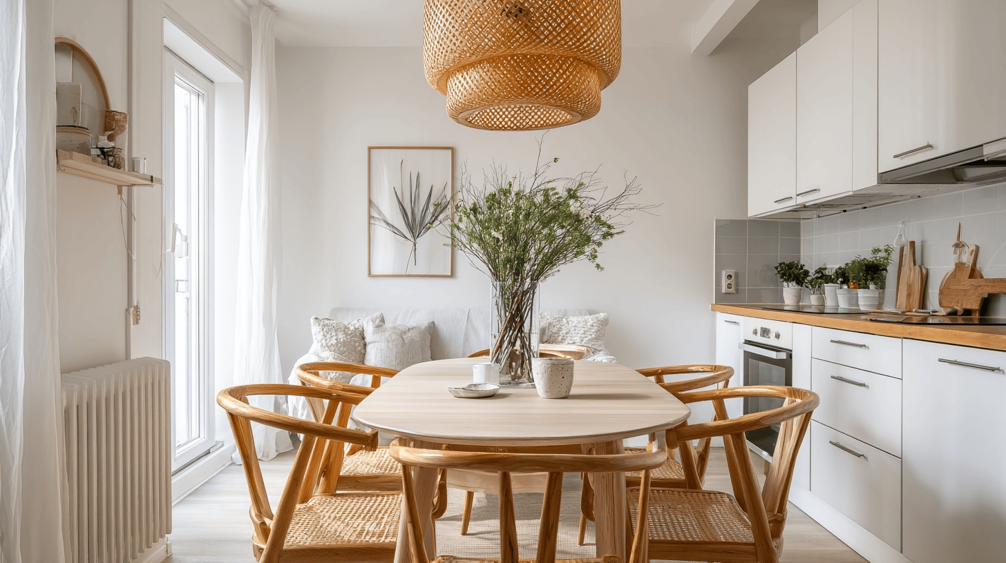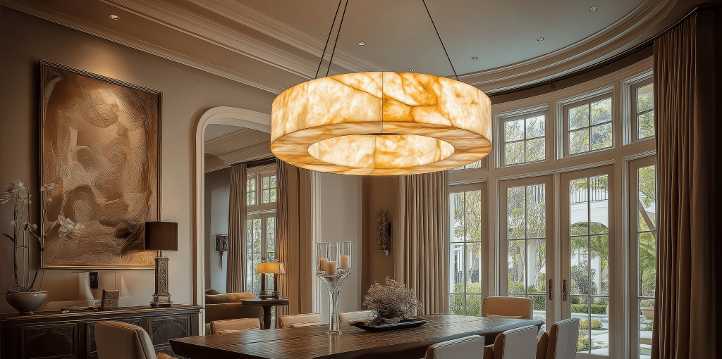 Go for crystal or metallic finishes if you want a luxury dining area design, or try rattan and matte-black fixtures for a casual, modern edge. Just make sure the size fits your table. Too tiny and it looks lost, too large and it overwhelms the space.