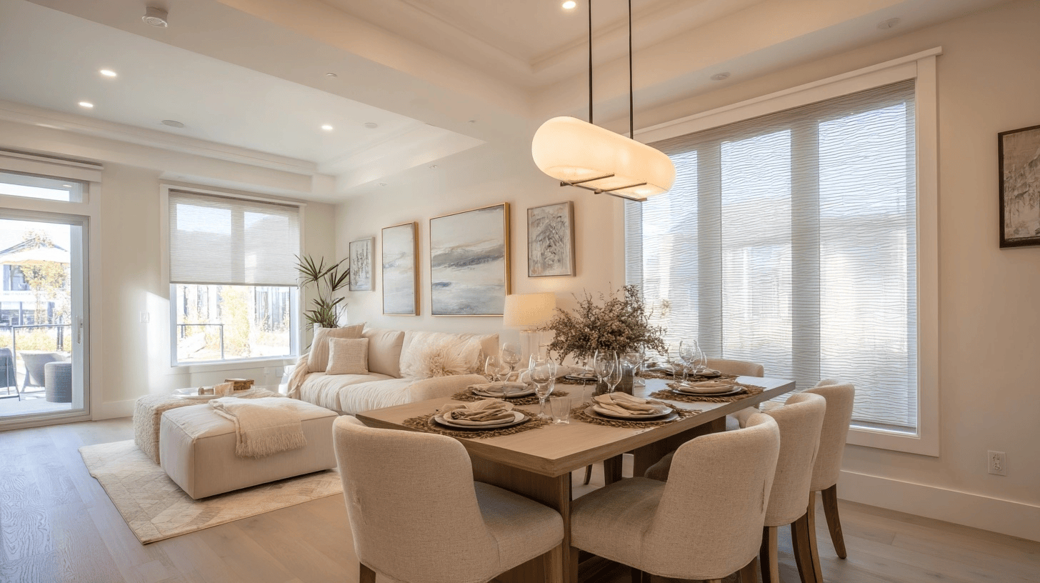 A layout with a central dining table, pendant lights, and low visual barriers works best. Neutral tones and consistent materials across the kitchen and dining space help both areas feel cohesive and connected.