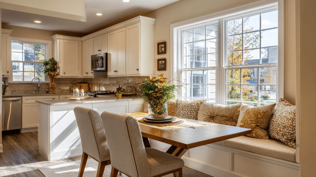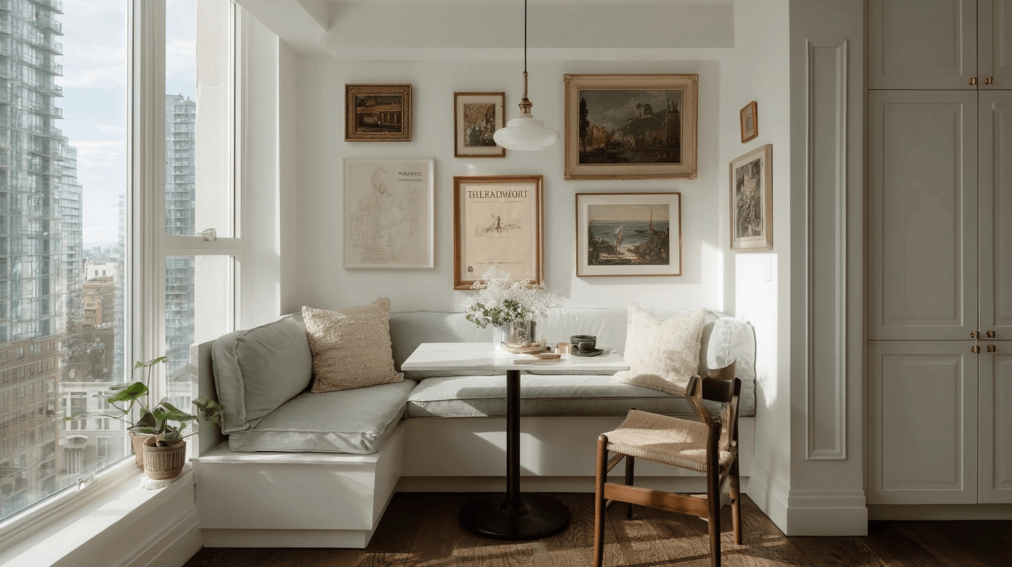 A banquette, or a built-in dining bench, is a clever way to seat more guests while saving precious space. A cushioned bench against one wall with a sleek dining table in front can turn breakfast into something you actually look forward to.