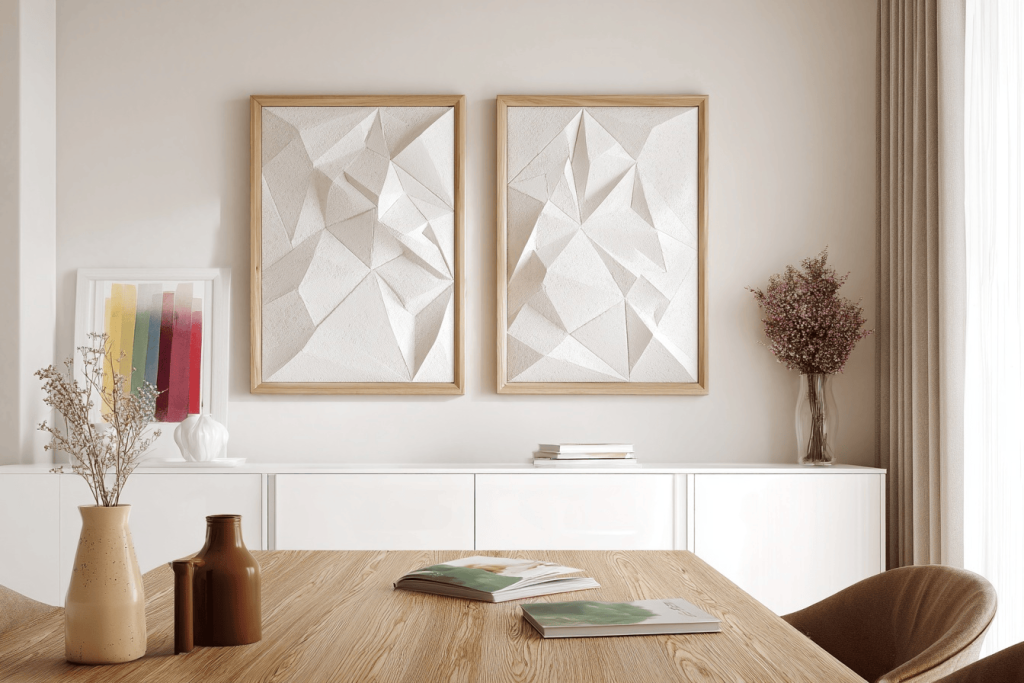 For a simple dining area design, neutral tones and minimalist line art usually do the trick. If your taste leans traditional, consider Ajrakh prints, Pichwai art, or botanical illustrations.