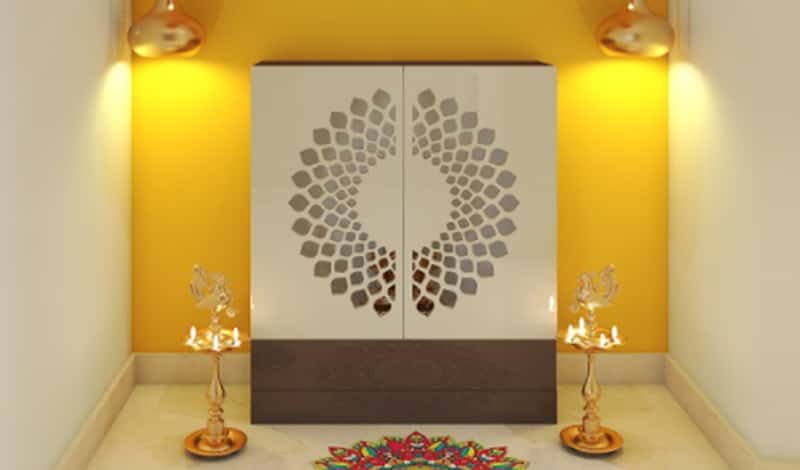 As a pro tip: Remember that a white pooja room will be relatively more high maintenance.