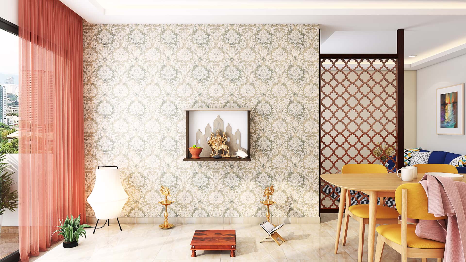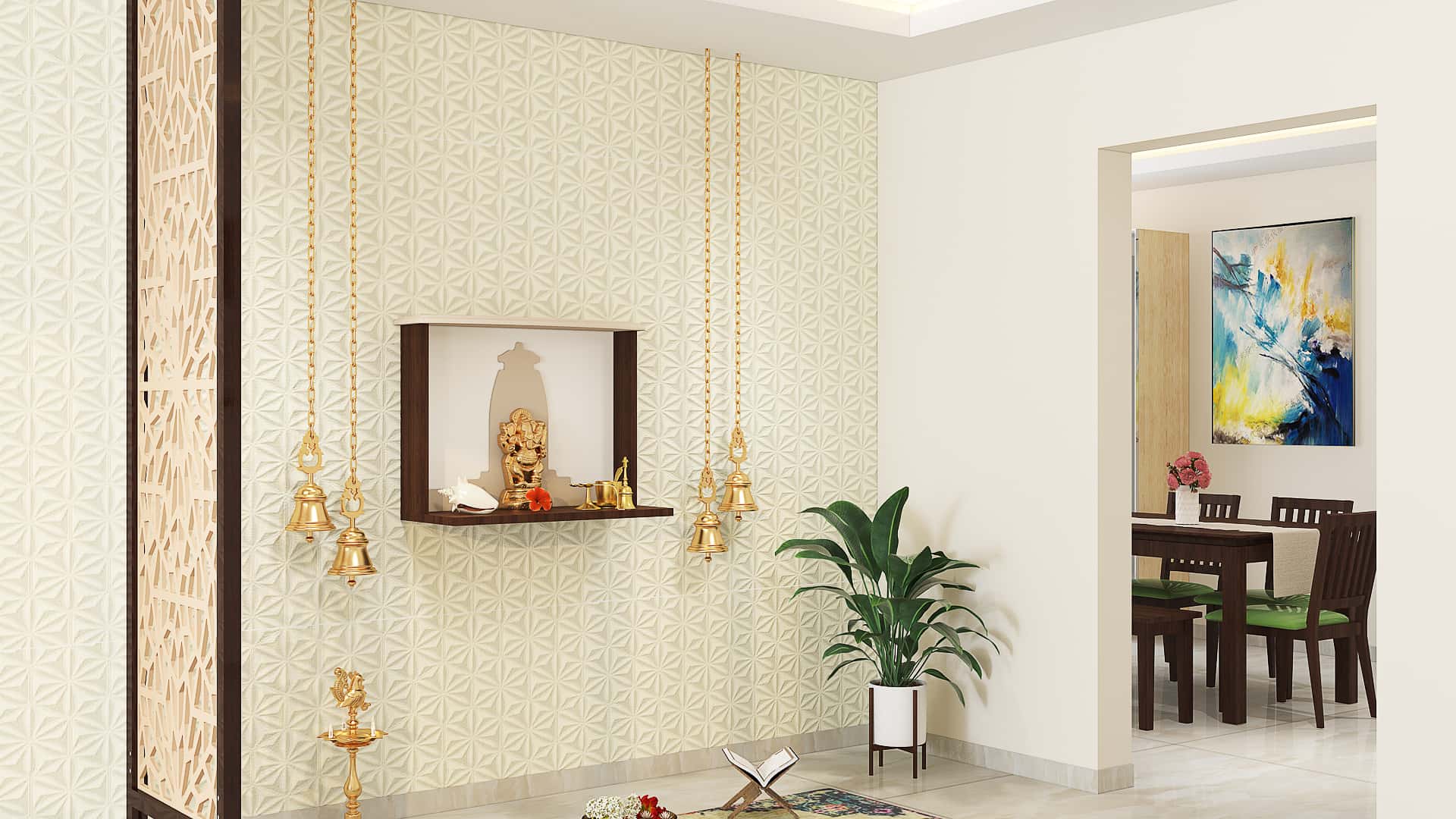 Nothing says purity like a pooja room done up in shades of white. The colour accentuates the ‘essential’, so you can never go wrong with this classic colour. If you’re sceptical about going all-white, remember that you can always experiment with light wall textures and patterns, as you can see here: