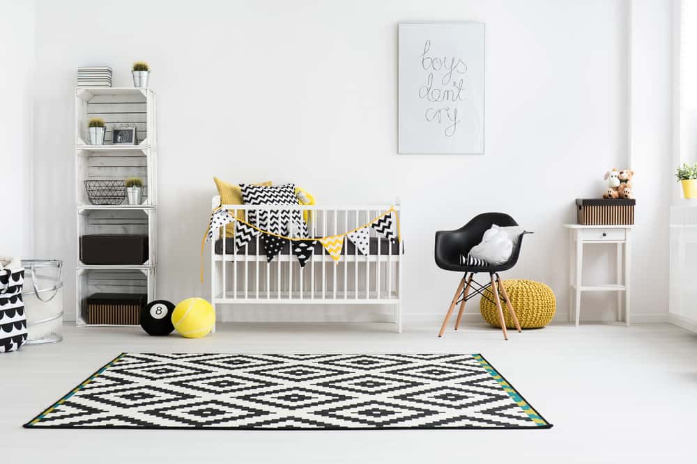 Nurseries don’t always have to be bright with splashes of the rainbow; that’s just old school thinking. Black and white is a chic combination that is great for both boys and girls. The beauty of this combination is that you can add one bright colour for the accessories in the nursery and it will pop.