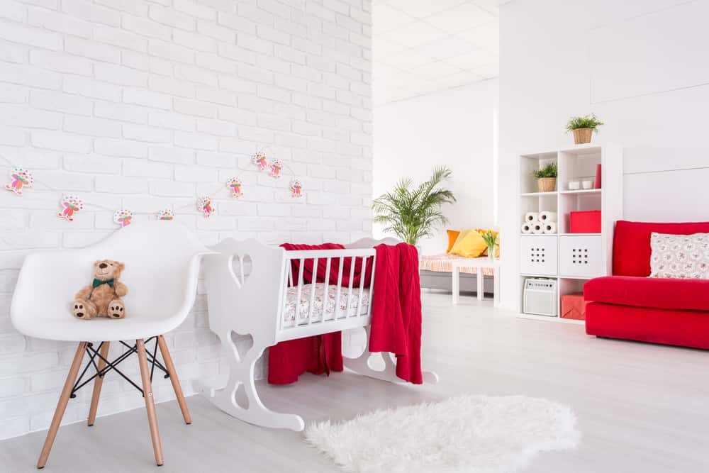 White walls and furniture with red accessories like pillows, comforters or a sofa is a favourite colour scheme among parents. The white makes the nursery look spacious and cheerful while the red stands out as a strong contrast, adding a splash of colour that your baby will no doubt find exciting.
