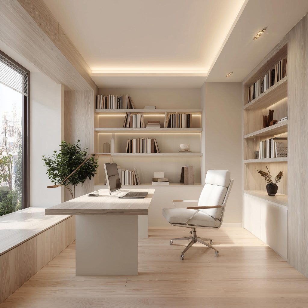 Avoid overly decorative patterns that can distract or feel busy. A simple, structured ceiling supports productivity.