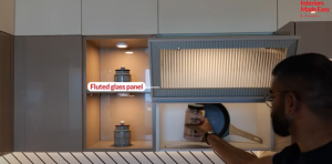 Fluted glass lift-up units with sleek aluminium frames allow easy access to daily essentials, while closed cabinets nearby store utensils and kitchen tools. Spotlights inside the open shelves and glass cabinets showcase pottery and other collectibles.