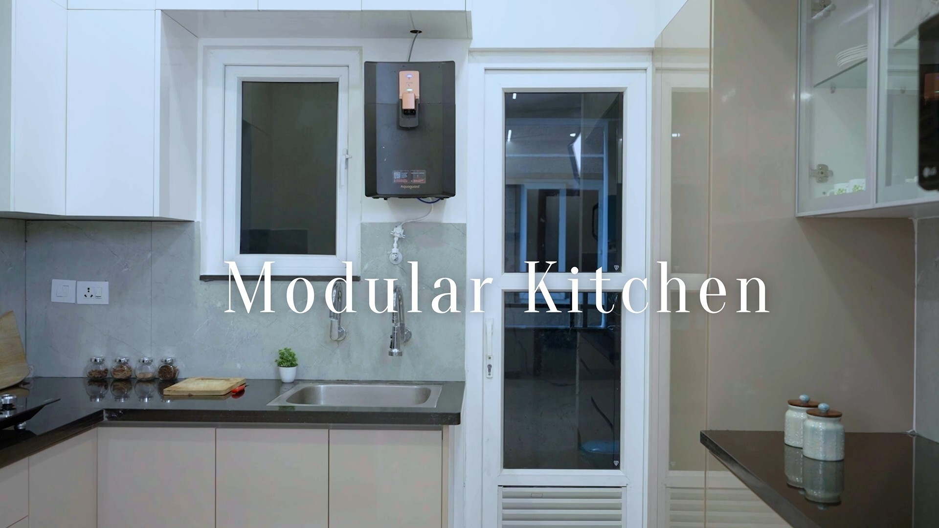 The base units include a three-drawer system for cutlery, cups and saucers, and plates and pans; a two-tier bottle pull-out; a shutter unit with adjustable shelves; and a completely handle-less finish for a seamless look. On the opposite side, tall storage and a set of four drawers add ample space for groceries and heavy utensils. Overhead cabinets include aluminium profile shutters with clear glass, adding elegance without blocking visual openness.