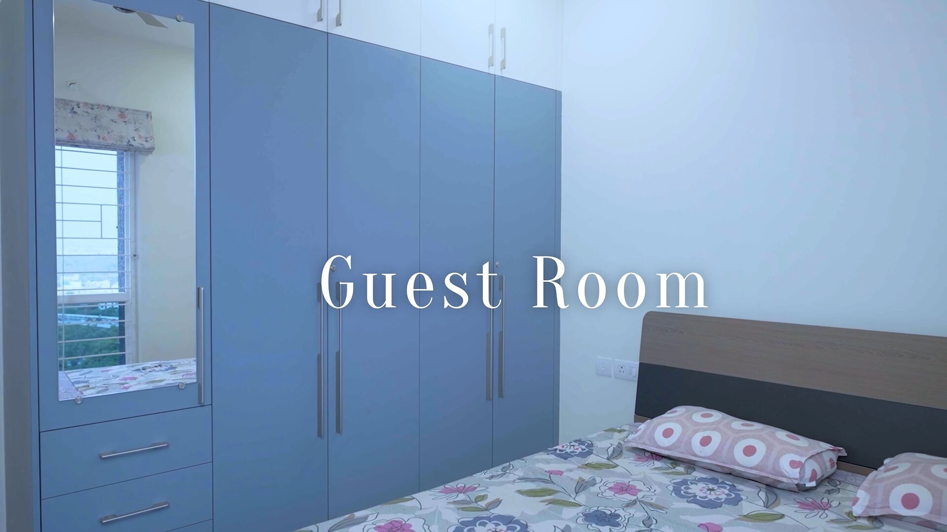 The wardrobe includes long spy-finish handles, a corner unit, three lower drawers, and a shutter with a full-length mirror that doubles as a dressing space. The entire layout keeps the room light, airy, and welcoming for guests.