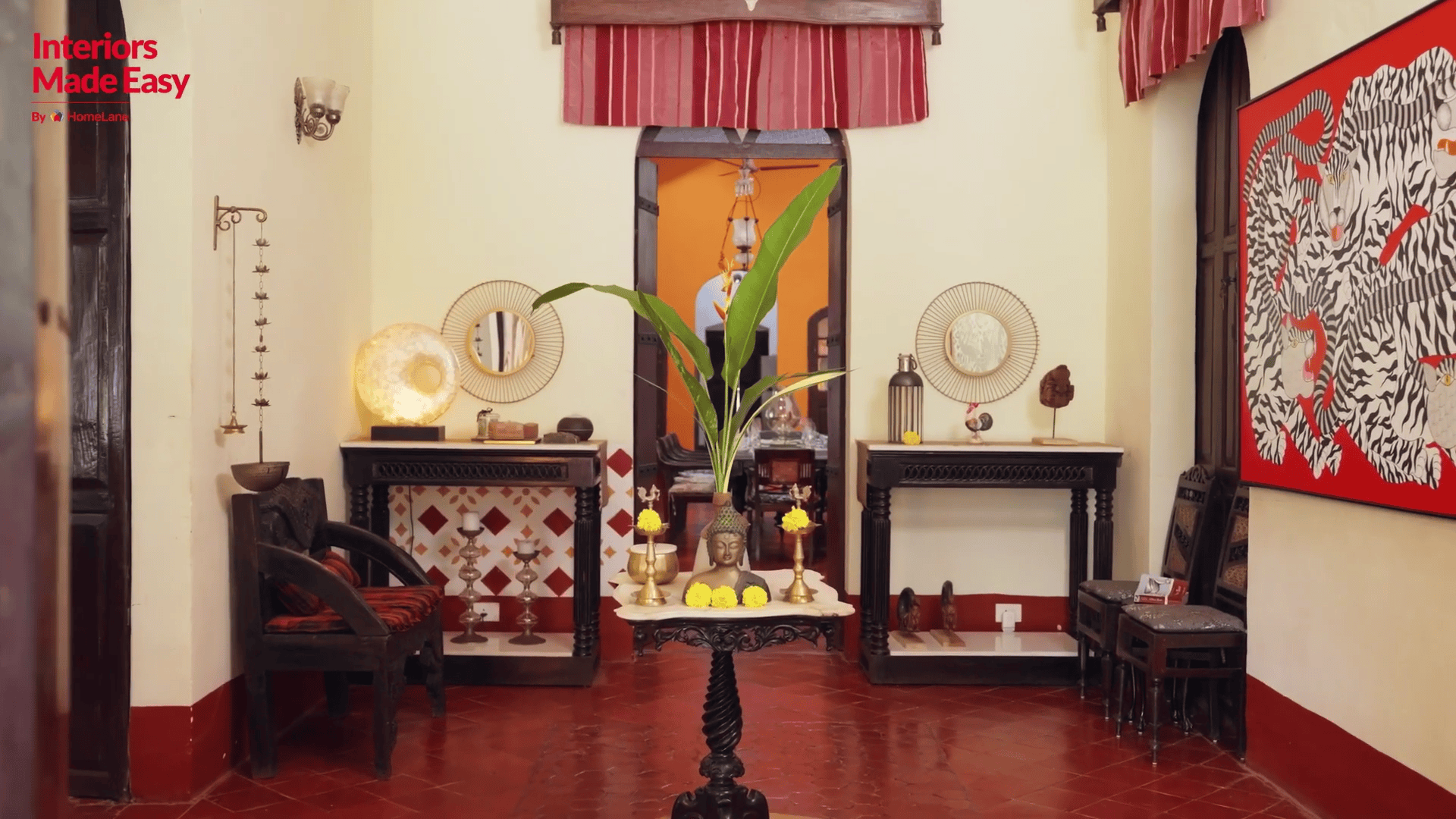 The foyer is another space decorated with unique console tables and a statement art piece, reflecting the home’s interesting nature.