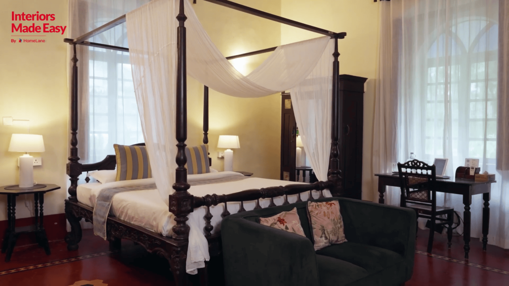 The bedrooms maintain their own personality while staying rooted in the home’s character. Furniture in these rooms includes carved vintage four-poster beds with sofa seating at the foot, handwoven cane chairs, and wardrobes with intricate detailing, blending old-world charm with modern sensibilities. Even storage solutions were retained, showcasing design sensibilities rarely seen in contemporary homes.