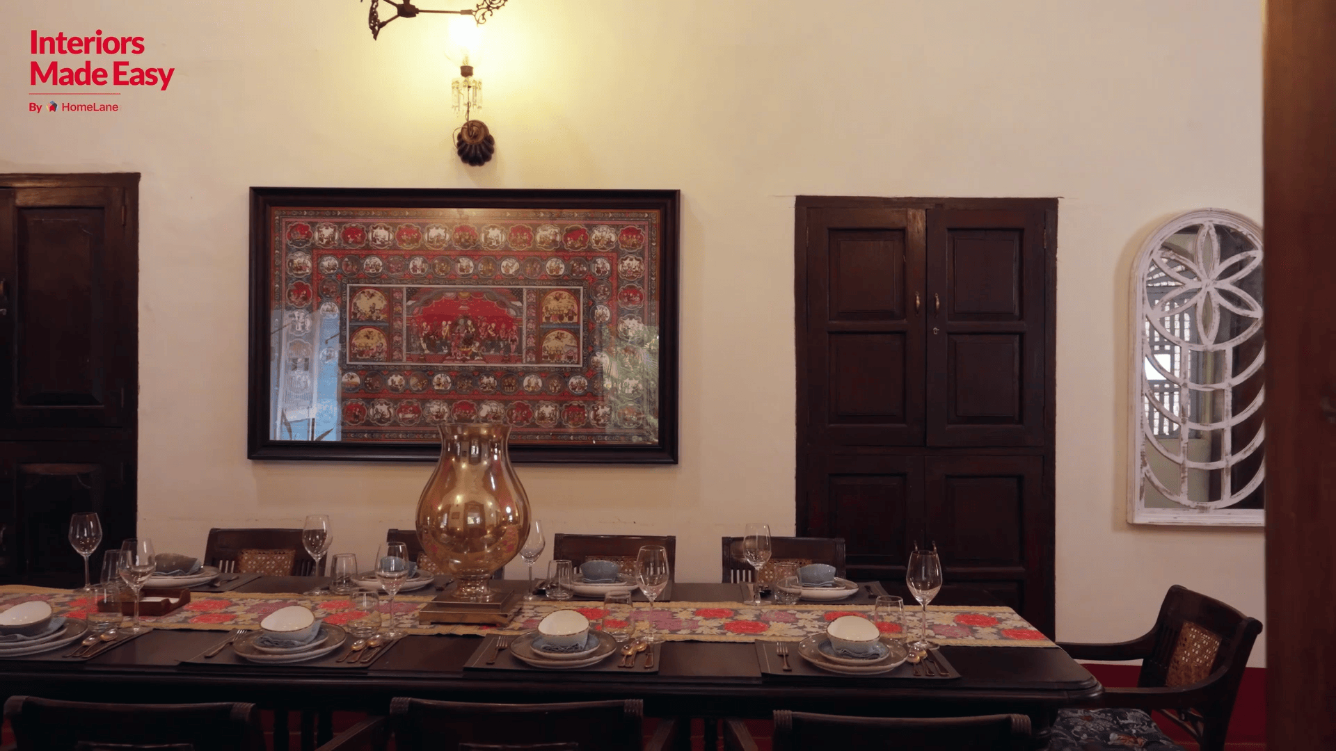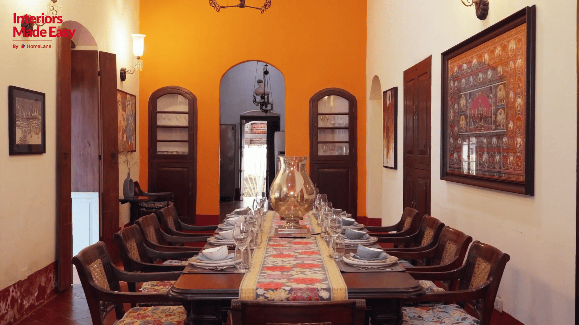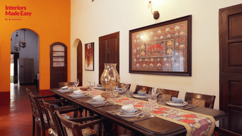 The dining area, which overlooks the pool and garden, was designed as a visual break from the rest of the home. This also became the only space with a pop of colour and a curated art theme. It is embellished with statement art pieces across all the walls, a vintage dining space, and two hand-carved crockery units.Â