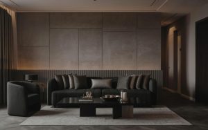Create a focus wall behind your sofa with stucco plaster that forms undulating waves with a three-dimensional effect. Focus a series of downlights on the wall to highlight and add drama to the texture.