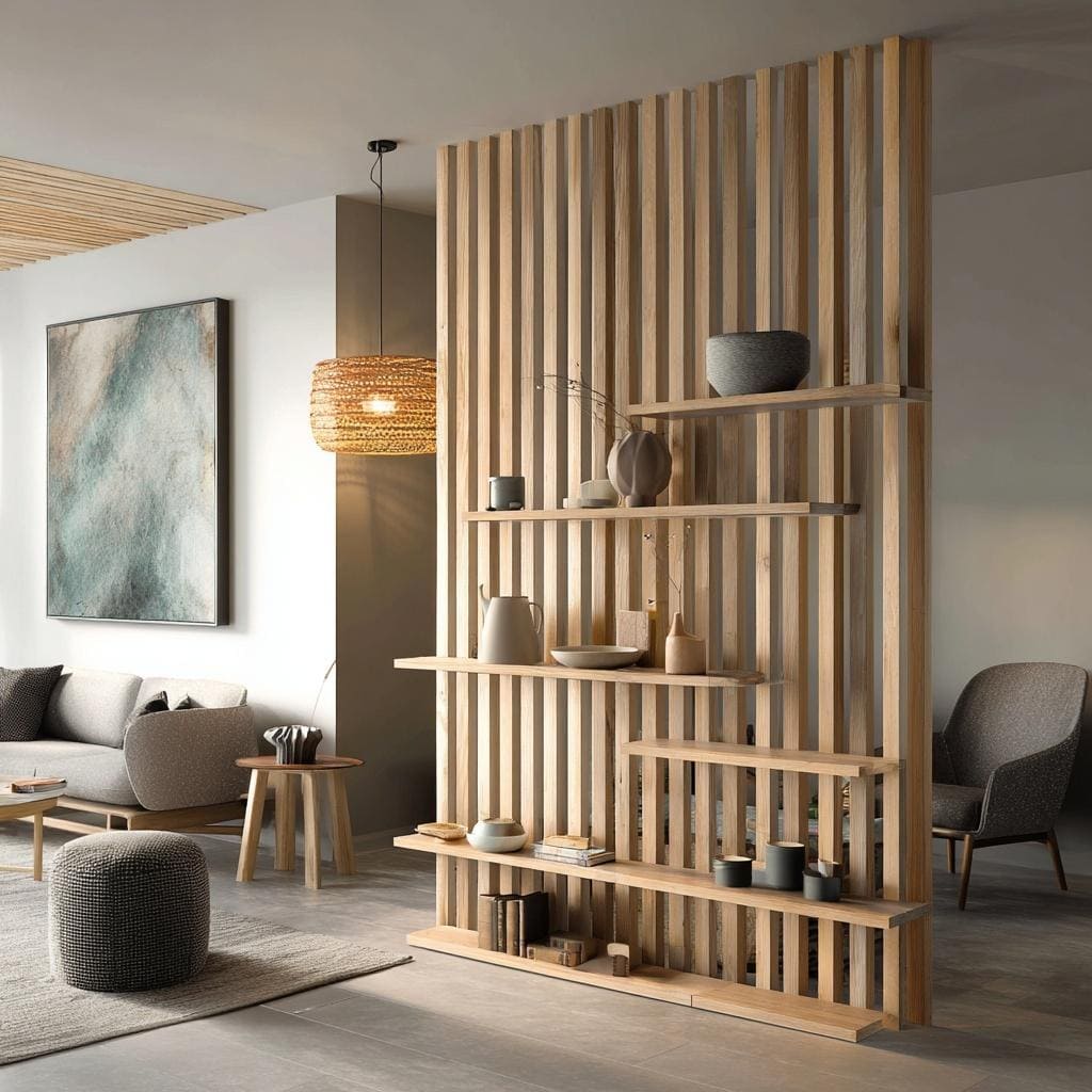 Minimalist modern partition for living room featuring vertical wooden slats and shelves.