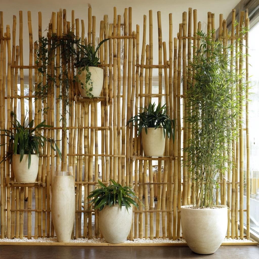 Sustainable bamboo partition for living room decorated with various indoor potted plants.