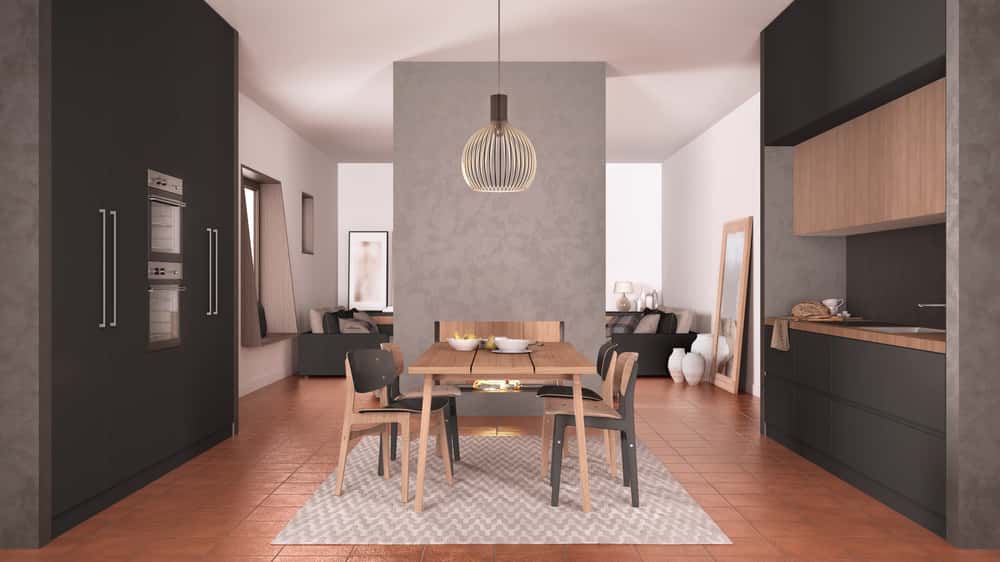 Earthy and charming, the gorgeous sun-kissed orange-brown of terracotta tiles go surprisingly well with just about any other colour in the spectrum. Here, black cabinets and grey walls highlight the simple beauty of nature’s favourite flooring.