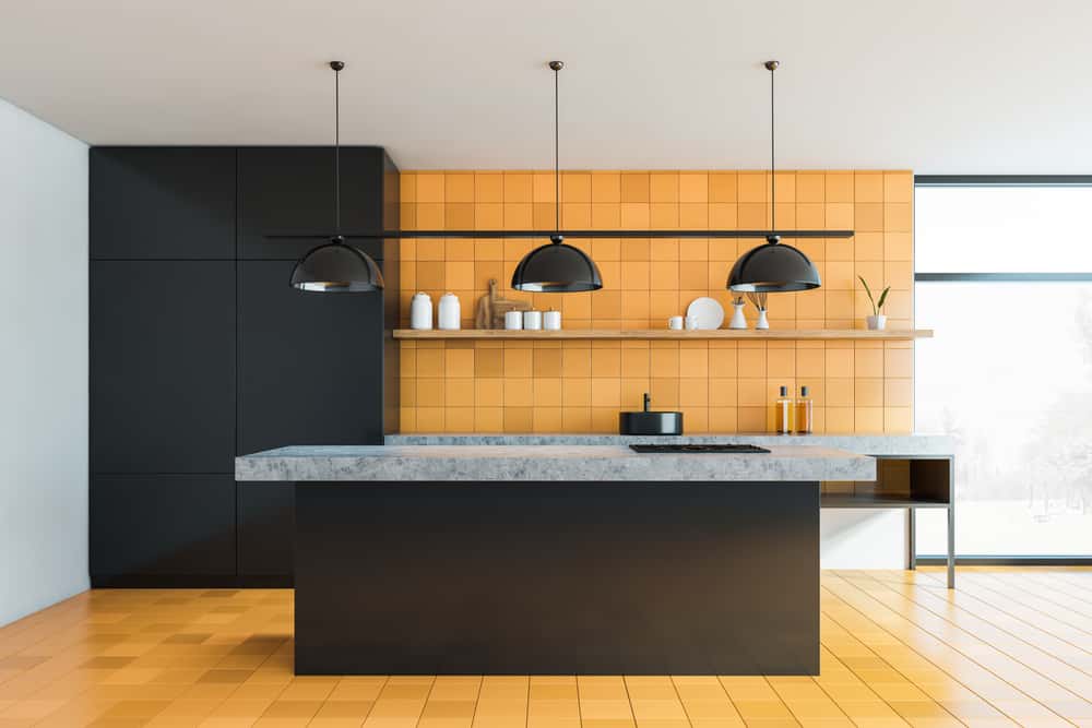 There’s nothing to beat the warmth and cheer of golden yellow, and when it’s paired against stark black it makes for a truly arresting combination. Square tiles in a mishmash of shades of yellow, both in the floors and the backsplash, add mellow tones to this bold black kitchen.