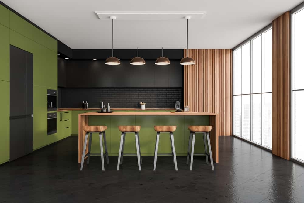 Peppy green walls and cabinets add vibrancy and punch to this modern kitchen, but it is the glossy black floors that quite steal the show! Matte black cabinets bring a sense of continuity, seamlessly melding with the flooring. Note how the flooring is textured rather than polished, which is always safer in a space that is subject to moisture and spills.