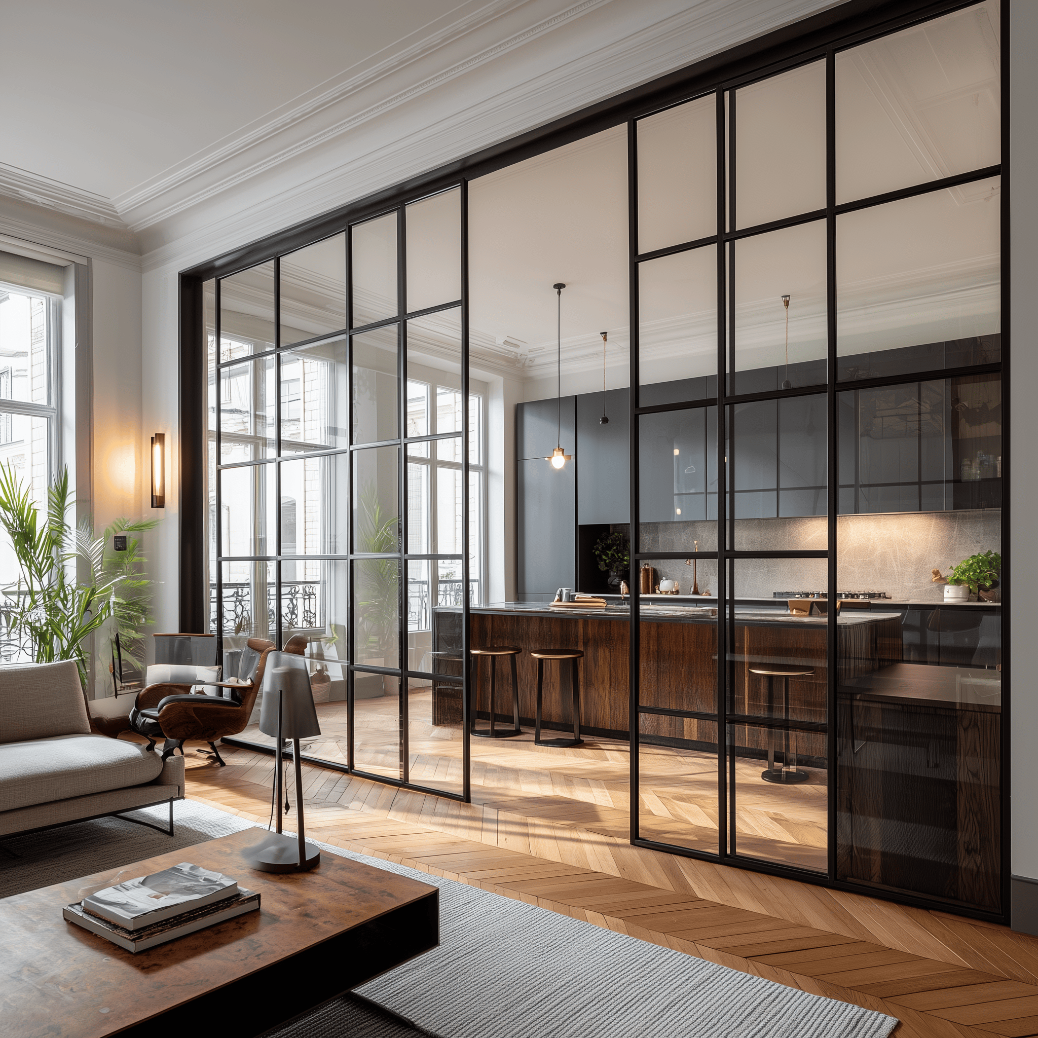 Frameless glass sliding doors are trending heavily right now. They’re minimal, almost invisible when closed, and they maintain the open feel while giving you the practical option to separate spaces.