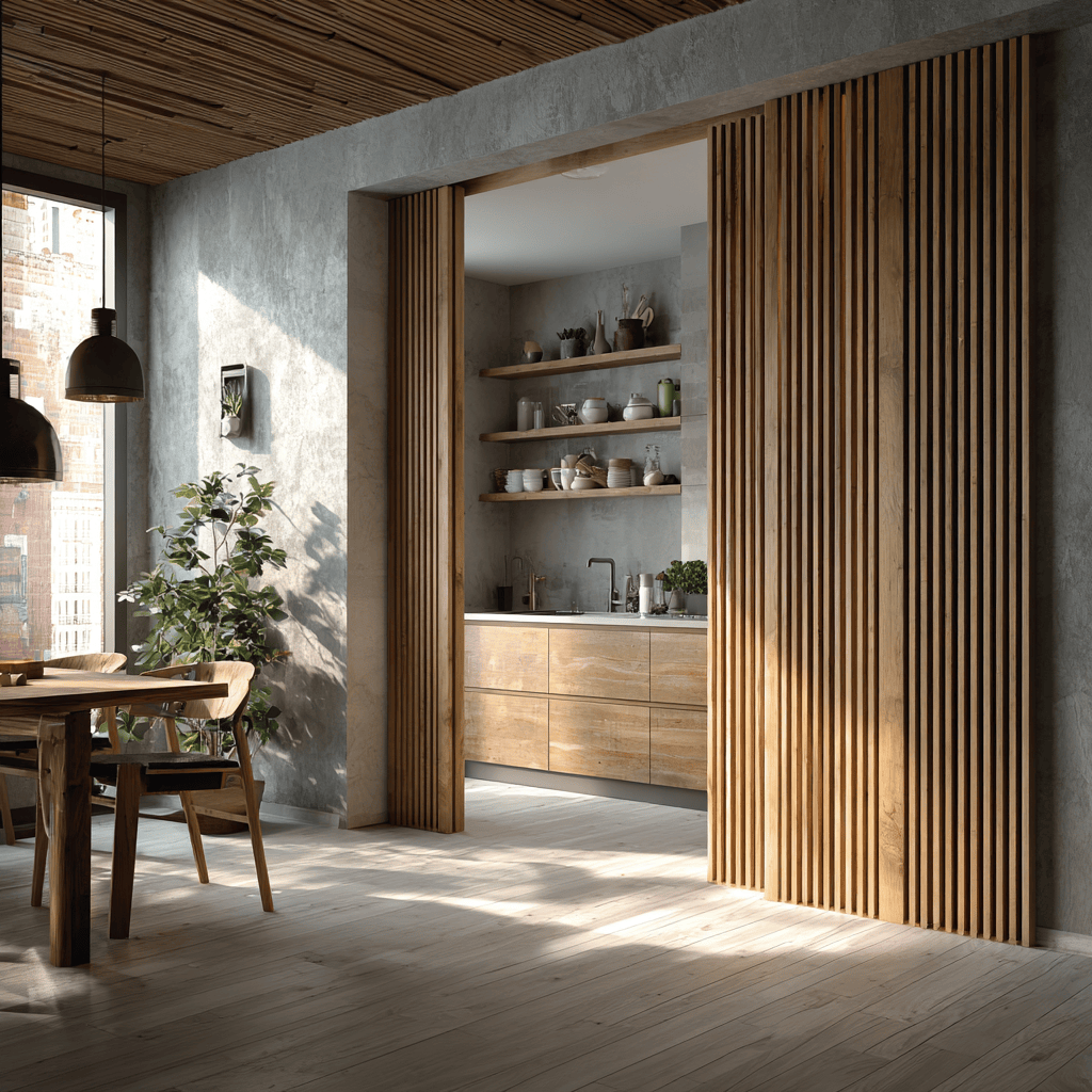 Wooden slat doors, where thin wooden strips are arranged with small gaps between them, offer a compromise. They allow some airflow and create interesting light patterns while still providing separation.