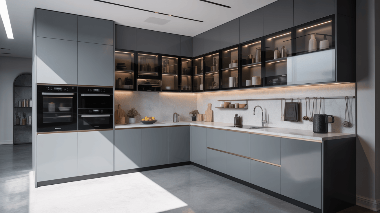 Embrace a minimalist, clutter-free look with sleek, handle-less L-shaped kitchen cabinets. Opt for laminates or acrylic finishes in muted tones like graphite grey, olive green, or off-white. This creates a continuous, streamlined appearance that makes the space feel larger and is incredibly easy to maintain.