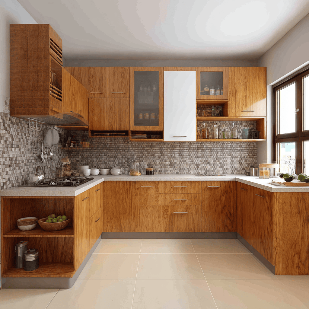A U-shaped kitchen increases cabinet length and countertop area. This naturally raises the cost too. Pricing typically starts from INR 3.5 lakhs and goes up based on materials.