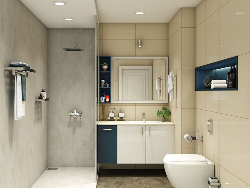 This two-tone bathroom cabinet perfectly nails contemporary style, with its neat, minimalistic styling and lovely pairing of deep blue on white. Open shelves alongside the mirror allow easy easy access to everyday items. The bathroom glass partition allows visual transparency, seamlessly divvying up the wet and dry spaces and ensuring hygiene.