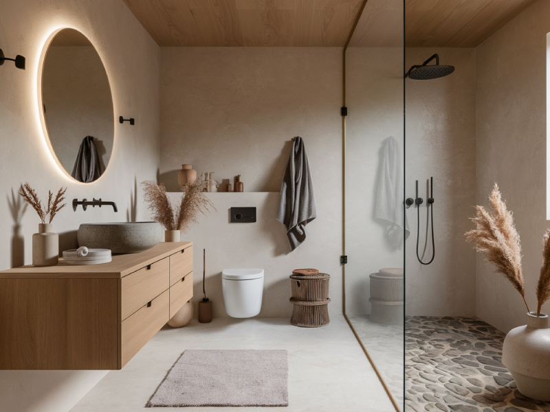 A soft, earthy bathroom interior with a clean, fuss-free look. The floating modular vanity keeps daily clutter tucked away, and built-in shelves handle the rest. Perfect for Indian homes that want calm mornings and easy upkeep. It’s a smart, space-saving bathroom design for home—simple, elegant, and made for real life.