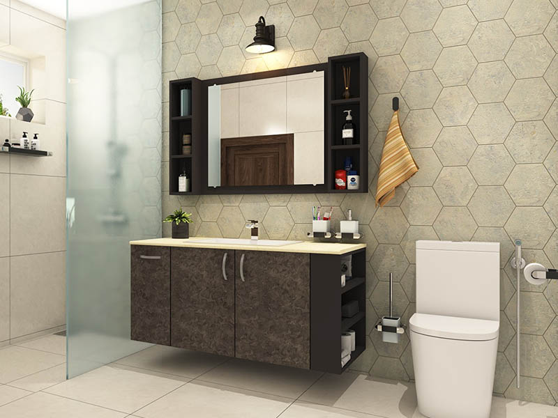 The clean lines of this grey laminated bathroom vanity come with plenty of space-saving, efficient storage solutions. Open bookshelves on the side are a thoughtful addition for those who love to read while using the pot. The bathroom mirror idea incorporates convenient open shelving on either side of the Belgian glass mirror, which gives all your toiletries a place to belong!