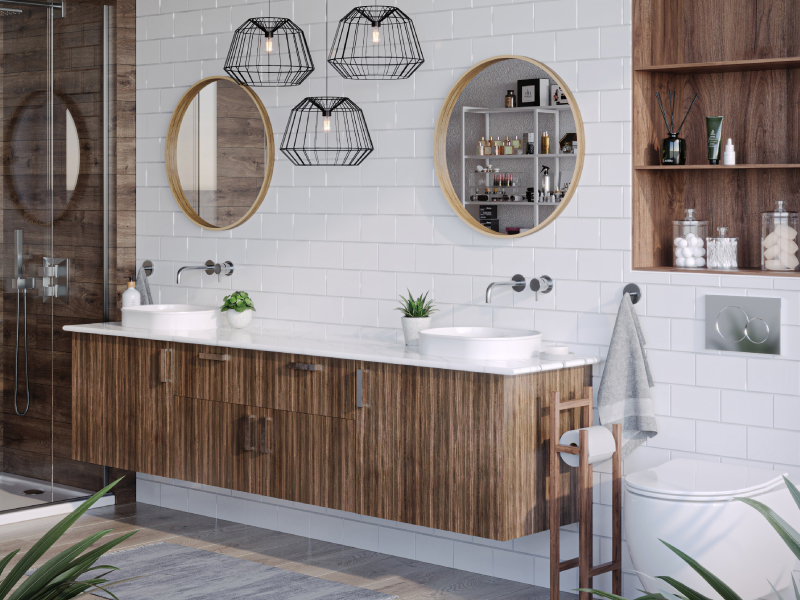 This warm, wood-toned bathroom interior pairs natural textures with modular convenience—just right for Indian homes. The floating vanity hides away toiletries and towels, while open shelves keep daily items handy. Easy to clean and built to last, this bathroom design for home is practical, stylish, and one of the best bathroom designs out there.