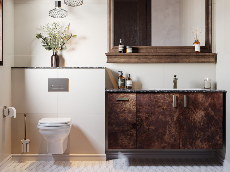 This warm-toned bathroom interior design blends Indian sensibilities with sleek modular style. The wall-mounted vanity keeps the floor clear, while closed storage hides away clutter. Wood textures, compact fittings, and layered lighting make this a calm, functional bathroom design for home—easy to maintain and built for everyday use.