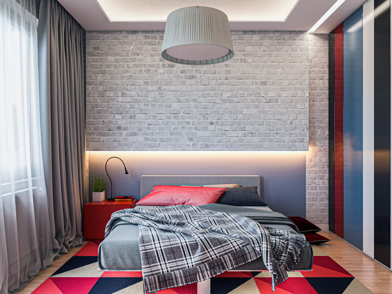 Bright and energetic, this teenager’s bedroom uses a palette of red, white and black for a lively touch. Distressed white paint on the exposed brick wall behind the bed dials down the drama and adds softness to the bold furniture and eye-catching rug. Floor-to-ceiling sliding door wardrobe designs reflect the colours in the room. We can guarantee that the young man in your life will love to come home to this spunky, vibrant room every evening!