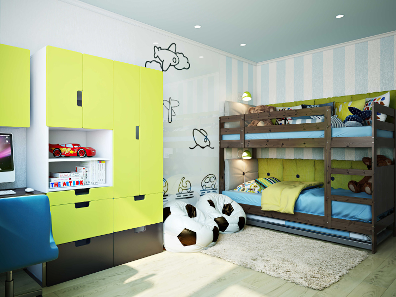 Beautifully put together, this boy’s bedroom is one that will grow with your child. Soft blue-and-white striped wallpaper serves as a backdrop to sturdy bunk beds, helping to balance and centre the space. The modular wardrobe design and study desk, both in a cheerful shade of lemon, complement the blue and green accents all around the room. Wall stencils of cars and planes, and football-shaped bean bags, add to the energy of the space.