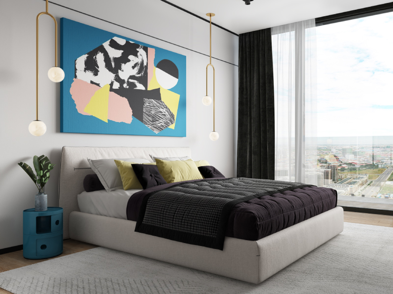 Grey, white and black make for a neutral, yet comforting choice of colours in this contemporary guest bedroom. With modern luxury bedroom detailing that includes an arresting abstract poster above the bed, a padded bed that’s high on comfort, and floor-to-ceiling drapes and sheers, this is a charming space that’s just right for everyone. We can guarantee your guests will never want to leave!