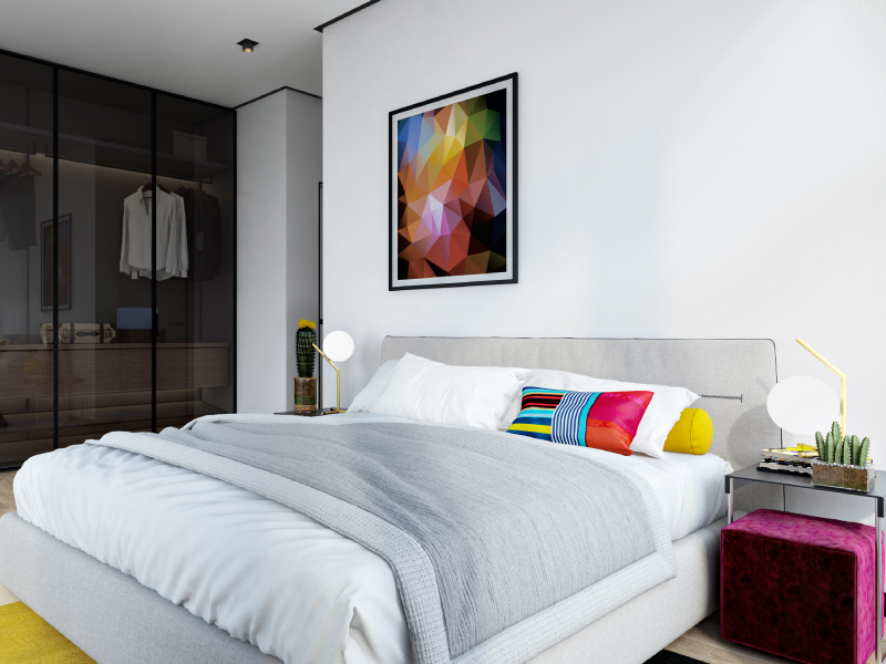 Stark and yet welcoming, this industrial-style bedroom theme features a walk-in closet area with transparent floor-to-wall shutters and plenty of storage space. Soft grey accents in the bed linen soothe and relax, while the startling pink bedside cabinet echoes the abstract artwork and single bold pillow on the bed. The expanse of white walls and muslin sheers maintain the cohesive look of the room.