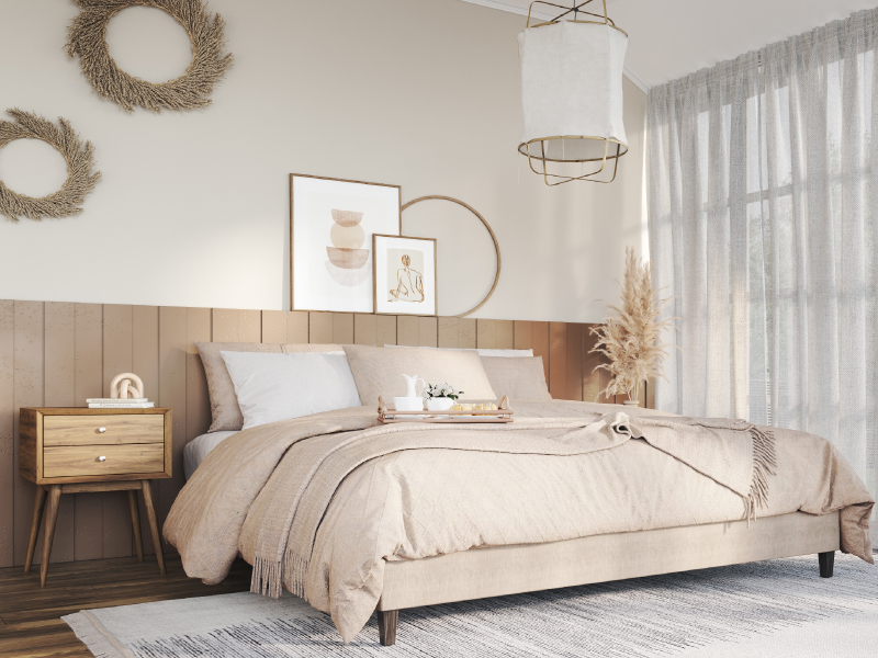 Whispering whites and pastel browns set the mood in this light-as-air bedroom theme straight out of a romantic fantasy. Organic bedcovers, a handmade wicker and paper lampshade, and jute wall hangings play on the sensibilities of sustainability enthusiasts. Wooden wainscoting on the walls and a charming wooden side cabinet add to the countryside charm. Now, this is surely a space that will inspire years of deep and dreamy slumbers!