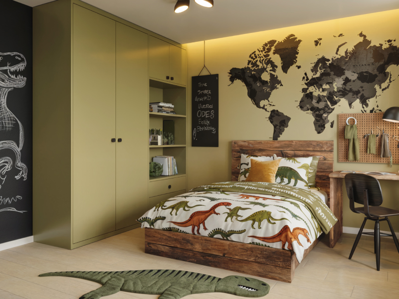 Perfect for a dino-loving boy who’s always full of questions! The tall modular wardrobe has open shelves for books and collectables, plus closed units to hide the mess. The bed has pull-out storage for toys and bedding, and the wall-mounted pegboard keeps school supplies in one place. Built to handle rough use, this room grows with your little explorer.