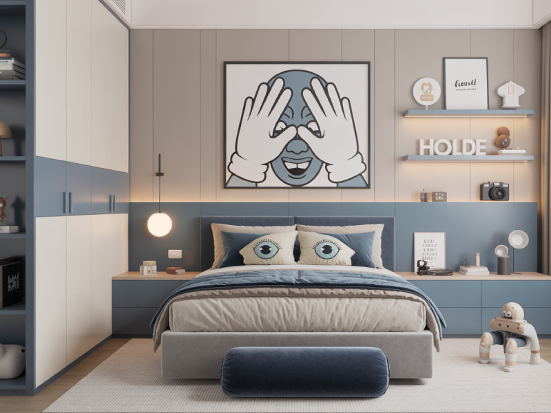 Perfect for kids who love a modern look with a fun twist. Spacious modular wardrobes keep clothes and toys tidy, and floating shelves display favourite books and treasures. The sturdy study unit makes homework time easy, while soft blues and quirky art keep the vibe cheerful. Strong finishes mean this room stays stylish and clutter-free as your child grows.