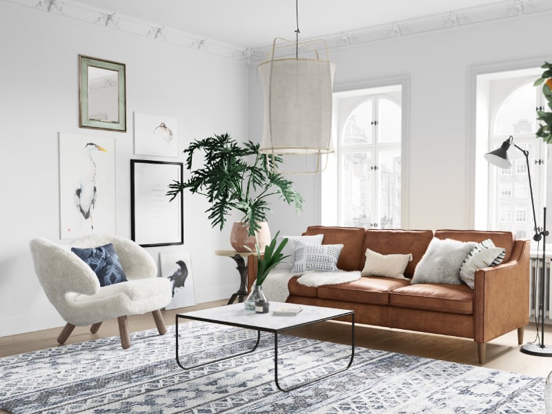As fresh as it is inviting, this clean and crisp living room is built for elegant lifestyles. The tan leather sofa introduces focus to the otherwise all-white interior design, and planters scattered all around ground the room with an earthy element. Plain white walls, bare windows, designer furniture and subtle weaves on the oversized rug add a touch of class.