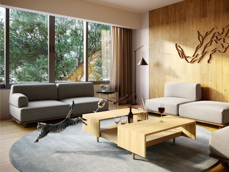 Timeless and modern home interior ideas will always be in demand, as this lovely decor proves! The wood-panelled accent wall with a contemporary, free-flowing metal mural is the highlight of this warm, light-filled living room. Sleek grey couches in a medley of styles, an interesting centre table in blonde wood, and a plush circular rug make up the furniture in the room.