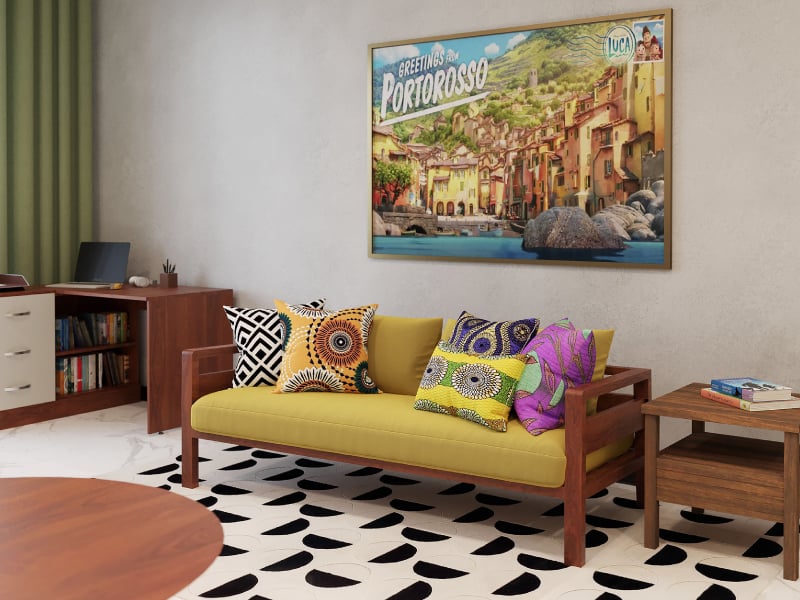 Here’s how to play off jewel tones against graphic patterns and textures for a boho-inspired look! The bright yellow couch sets the tone for cheer in this eclectic, colourful living room that’s perfect for a peppy lifestyle. Large, colourful wall posters add visual interest, with bright cushions in hues picked out from the wall art anchoring the space for a cohesive look. Check out the unique centre table, laminated in dazzling black and white stripes to match the wall cabinet.