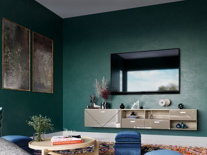 Looking for home interior colours that dare to be different? Here’s how you can reconnect with the earth, by choosing to dress your living room walls in bold forest green! The large mirrored wall creates the illusion of endless space, and the verdant garden views create a seamless connection between the outdoors and indoors. Accents of beige and red in the furnishings and artefacts around the room complement and tone down the shades of green.