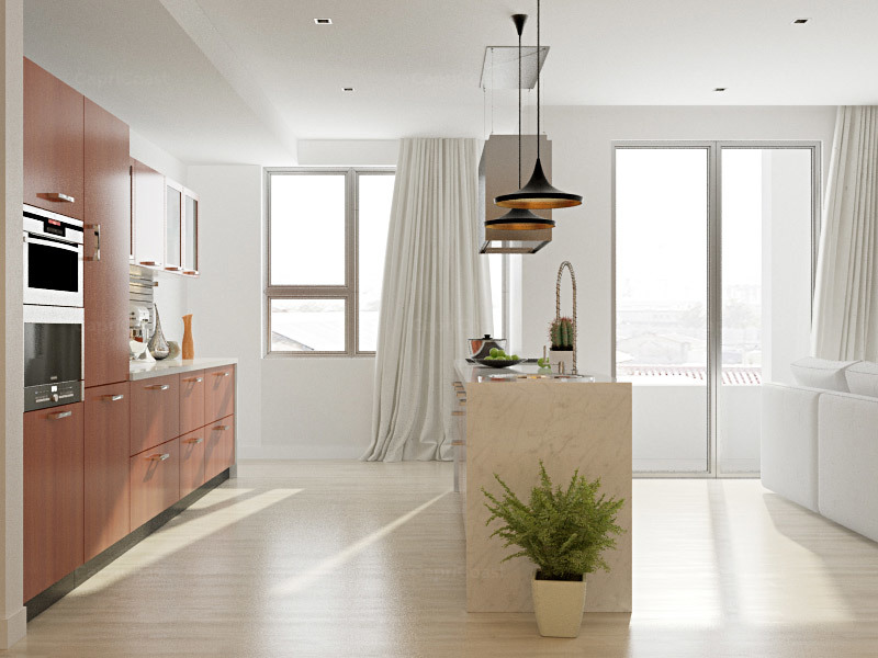 Experience the elegance of transitional kitchen interior design, with this oakwood parallel kitchen that maximises storage and functionality. The open-plan layout allows plenty of light on the warm grains of oak, eliminating dark corners and creating a cosy and inviting vibe. The tall pantry unit is equipped with space-saving accessories, while the built-in appliances keep countertops free.