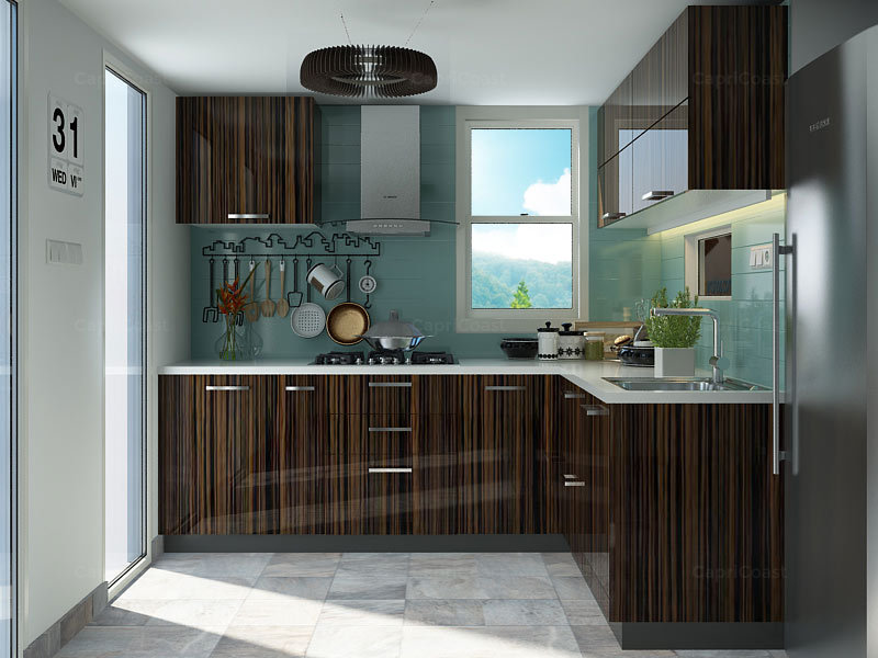Natural ebony wood tones in high-gloss laminate make all the difference in this small simple kitchen design. There’s so much to love in this tiny L-shaped kitchen that packs a punch with its spot-on functionality and space-saving accessories. The white kitchen granite design is heartwarming and very easy to clean, while the gorgeous sage green tiles add a pop of colour.