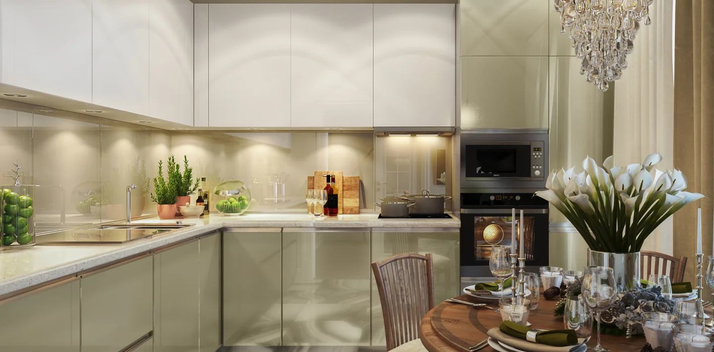 Clean finishes and glass shutters make even a compact kitchen feel organised and breezy.