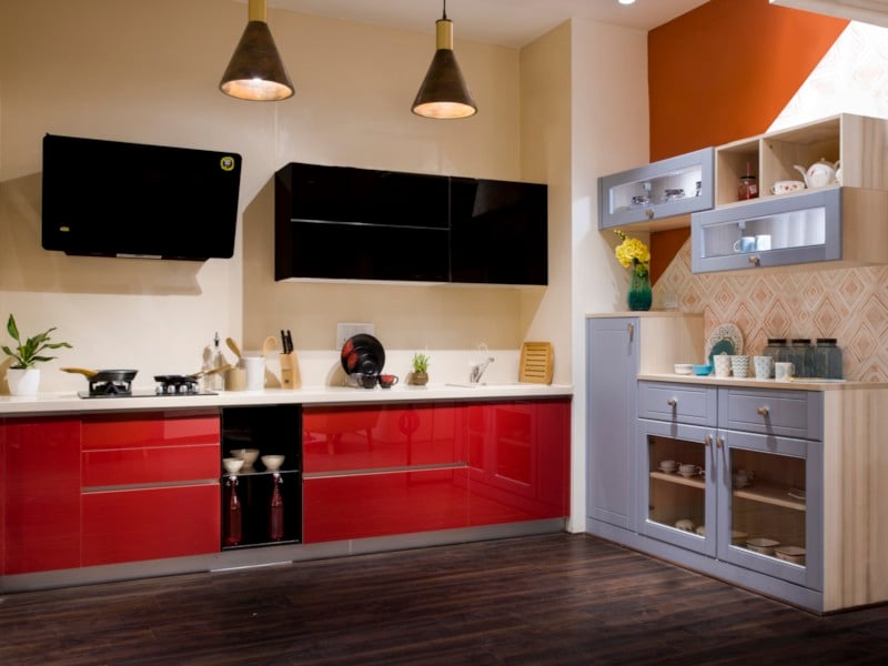 Red and black is always a bold combination, one that energises and makes any space stand out! Set your kitchen on fire with this straight contemporary kitchen interior design, and turn the heart of your home into a warm hub where family gatherings take centre stage. High-gloss acrylic cabinet finishes are super-easy to keep clean and give your space a high-end contemporary vibe. For balance, opt for a quiet, neutral kitchen tile design that blends into the background and allows the cabinets to shine. Notice the unexpected, quirky pairing with powder blue shelves on the adjacent wall? How cool is that!