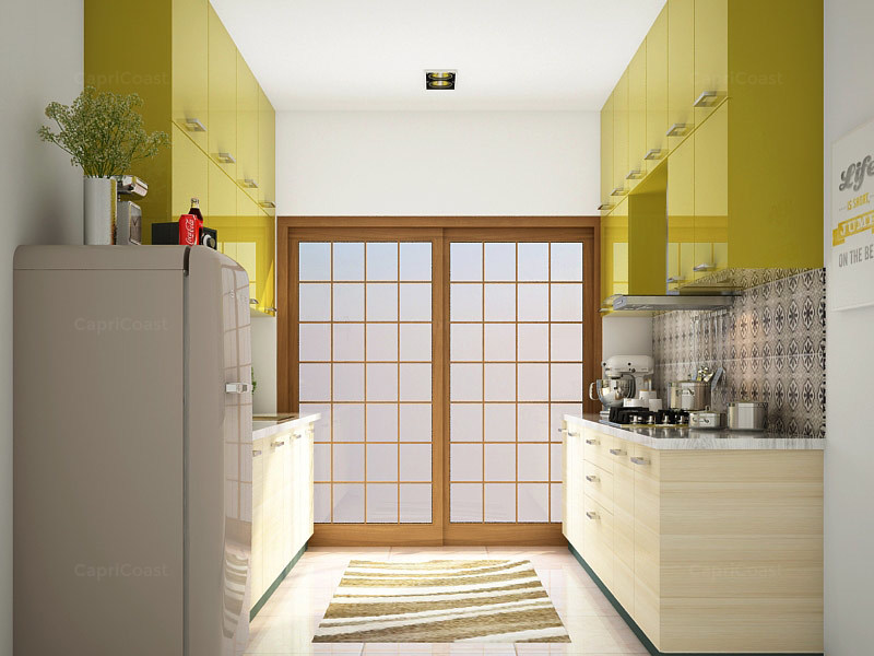 Looking for fresh and unique kitchen colour ideas? Create a distinctive space that matches your personality, with this striking combo! Light wood laminate in the cabinets below the counter adds utility and style, while the unusual henna green upper cabinets offer up plenty of storage in this small modular kitchen. The extra loft takes your storage all the way to the ceiling and allows you to safely stash kitchen staples or appliances that are not needed on a daily basis.